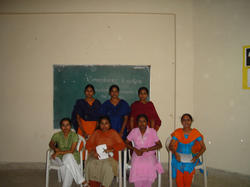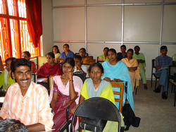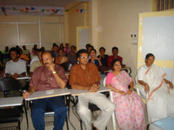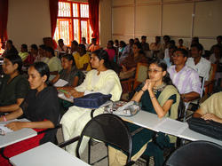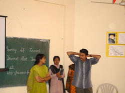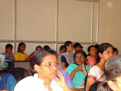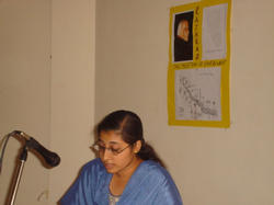 Karthika, I M.A reading the report on 10 Aug, 2006. Dr. Murli, who chaired the session is also seen