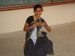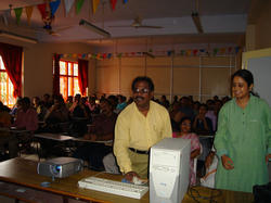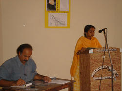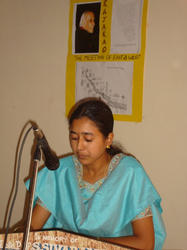 Karthika, I M.A reading the report on 10 Aug, 2006. Dr. Murli, who chaired the session is also seen